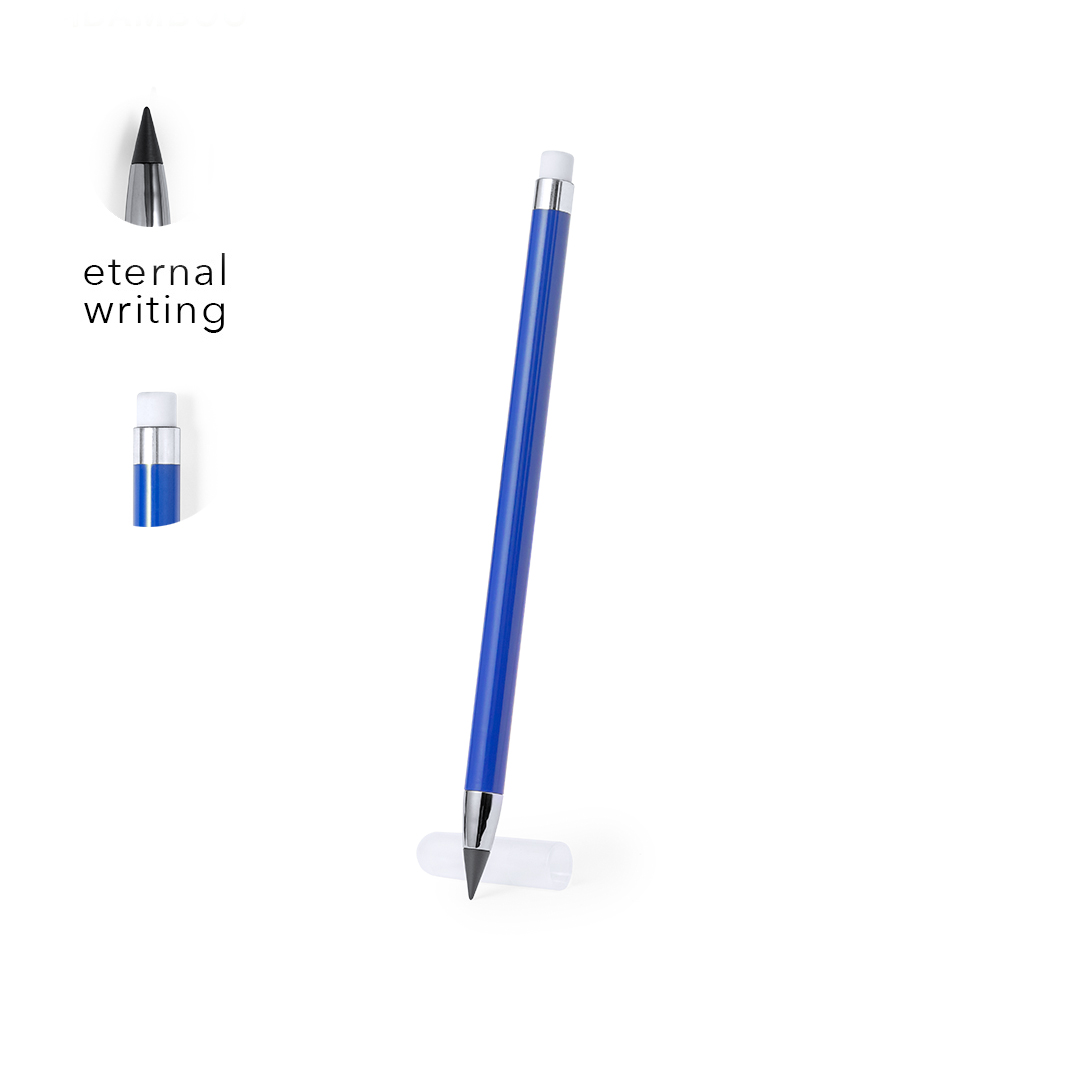 Lápiz eterno fabricado en resistente ABS. Reutilizable y con escritura infinita, para usar siempre el mismo lápiz y no generar residuos. Incluye goma de borrar en la parte superior del lápiz, capucha para proteger la punta, con estilo elegante combinando elementos de colores con elementos en plata. Disponible en una amplia gama de colores.