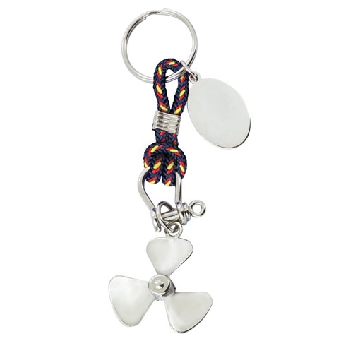 Llavero con una hélice marinera enlazado con una cuerda detalle bandera España. Incluye una chapa para marcar a Laser.Cada pieza en bolsa individual con utocierre (se sirve abierto, para su fácil manipulación)