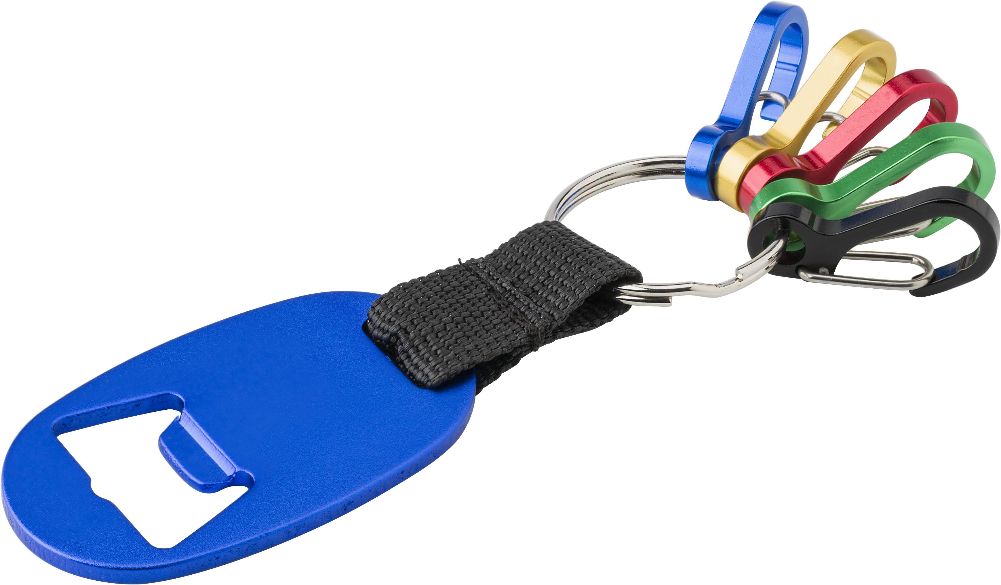 Llavero de aluminio con abridor y cinco mosquetones de colores.