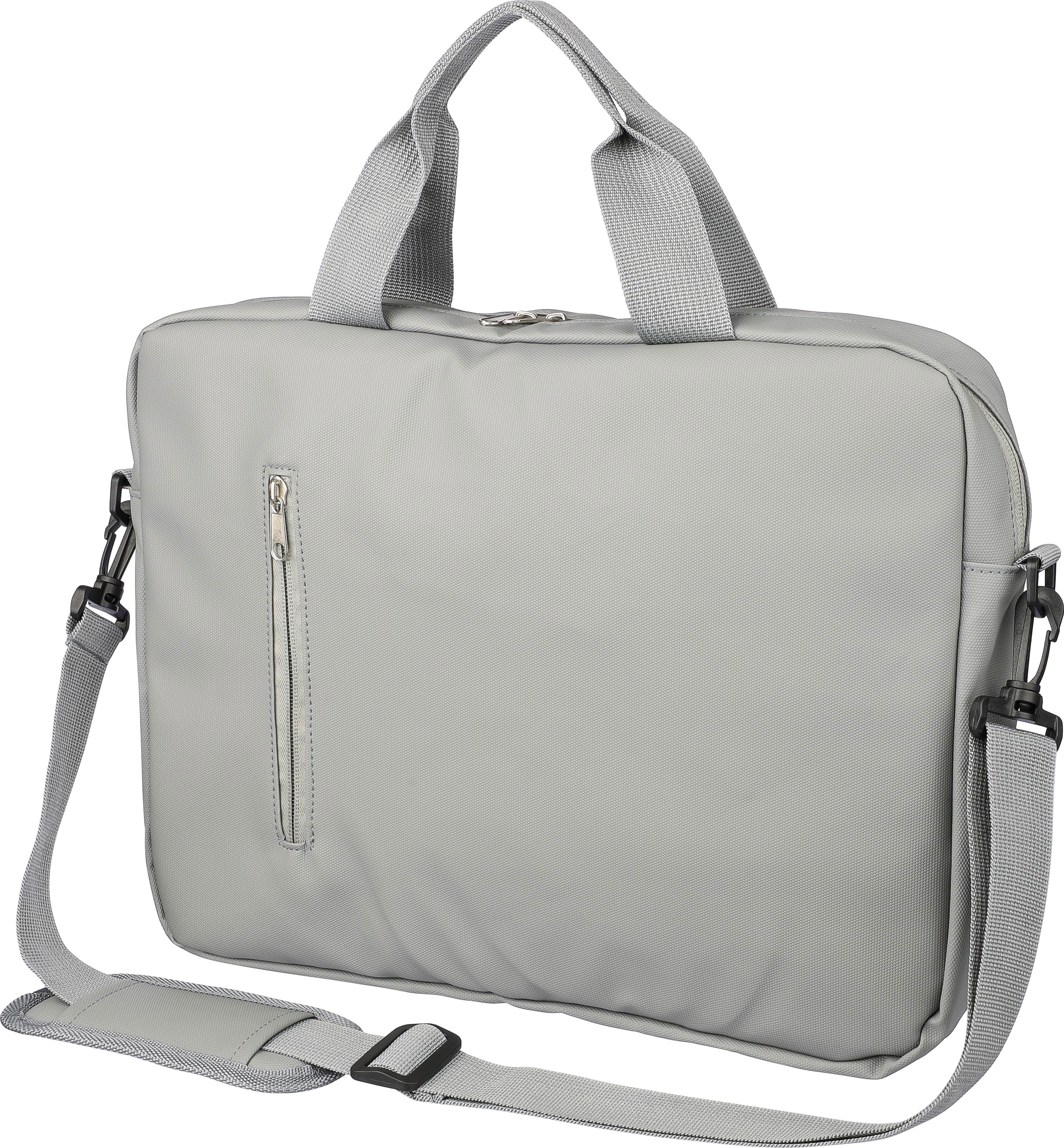 Maletín de PU para portátil (15'') con dos bolsillos frontales con cremallera, un gran compartimento con cremallera con una sección para portátil cerrada con velcro y múltiples insertos en el interior. Incluye correas ajustables y dos asas. Repelente al agua.