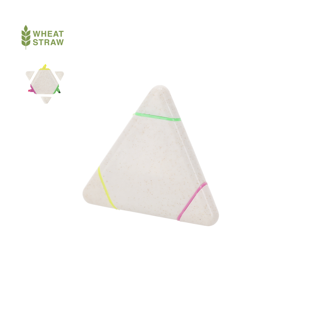 Original marcador fluorescente de tres colores fabricado en caña de trigo. Con cuerpo de triangulo en suave acabado brillante, especialmente diseñado para marcaje a todo color. Con capuchas opacas. La caña de trigo fomenta la utilización de materias primas naturales, reduciendo así las emisiones contaminantes.