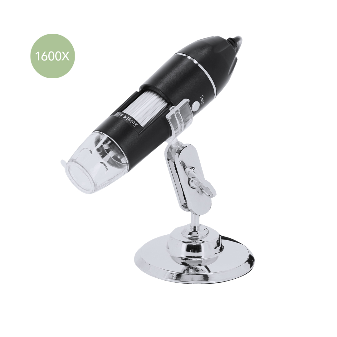 Microscopio digital compacto con aumento de 0-1600X. Luz LED ajustable y resolución personalizable hasta 1600x1200 de forma manual. Incluye soporte ajustable, cable de 140 cm con adaptador USB, Tipo C y Micro USB, para usar en diversos dispositivos. Diseño elegante en negro mate con detalles plateados, compatible con la app para Android. Dispone de regla de calibración y manual en español e inglés