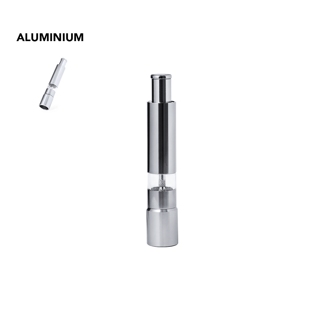 Molinillo manual para sal y pimienta fabricado en aluminio. Ideal para agregar la especia más deseada y utilizar con el picador manual en forma de pulsador. Cuenta con una ventana para visualizar el nivel. Presentado en caja de diseño kraft.