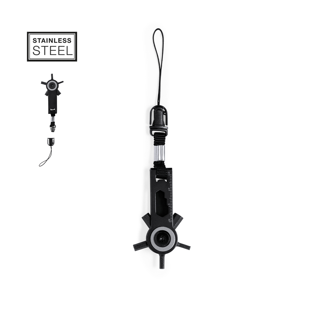 Eficaz multiherramienta con cabezal giratorio fabricada en acero inox y acabado en negro. Con 10 funciones: llaves allen, llave para tuercas hexagonales en varios tamaños, regla y un práctico accesorio de transporte con cierre de hebilla. Presentado en bolsa de papel reciclada de diseño kraft.