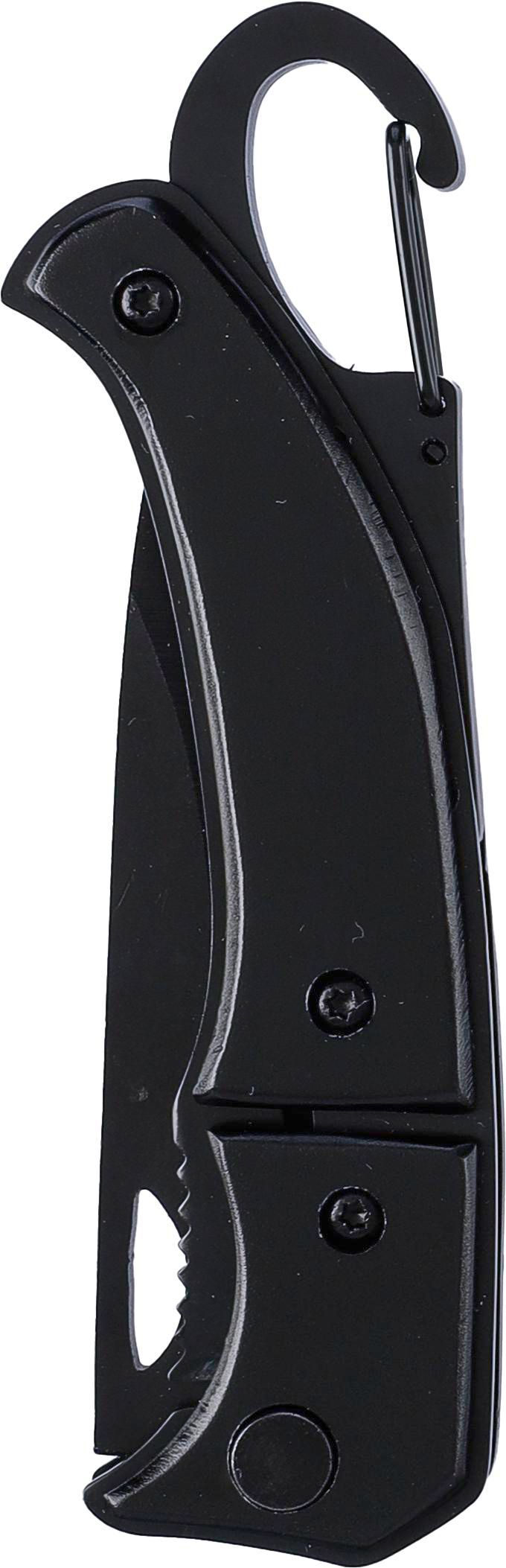Navaja de bolsillo de acero inoxidable con cierre de seguridad, mango de aluminio y mosquetón de metal (no apto para escalada). Presentado en una caja de cartón marrón.