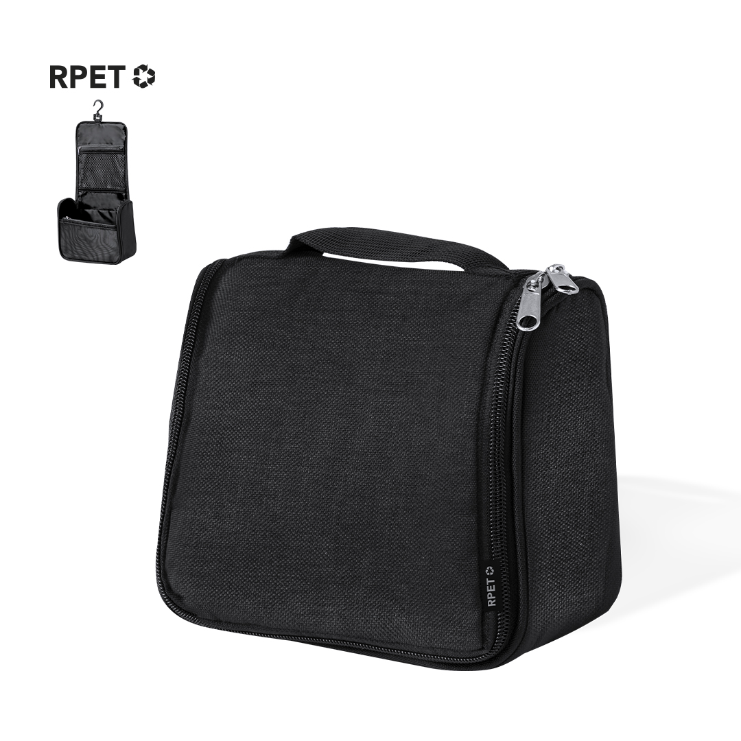 Neceser fabricado en RPET para guardar los objetos de higiene personal, con práctico gancho para poder sujetarlo en cualquier sitio. Práctico Interior con bolsillos de redecilla transpirables, que permiten ver los objetos que hay dentro. Con logotipo RPET en etiqueta. Disponible en varios colores y presentado en una bolsa individual reciclada. El material RPET se elabora a partir de plástico reciclado, para así fomentar la reutilización de residuos plásticos y ayudar a la sostenibilidad del planeta.