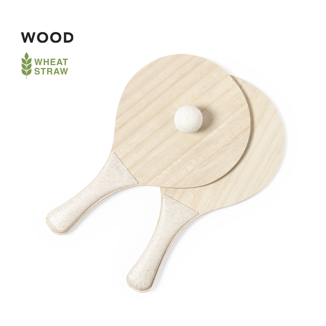 Par de palas de playa de línea nature. Fabricadas en madera, con mango reforzado en caña de trigo. Presentadas en bolsa de rejilla y con pelota de caña de trigo. Distintivo en el mango.
