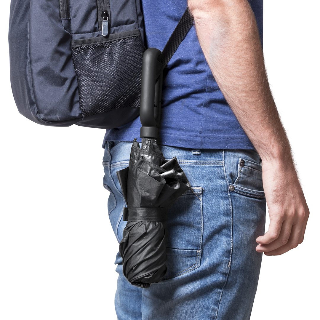 Paraguas plegable de 8 paneles en variada gama de colores. De 100cm de diámetro, apertura manual, con sistema antiviento y en resistente material pongee. Con varillas de fibra en color negro, cierre de velcro y mango ergonómico con mosquetón de enganche integrado. Presentado en funda individual a juego.