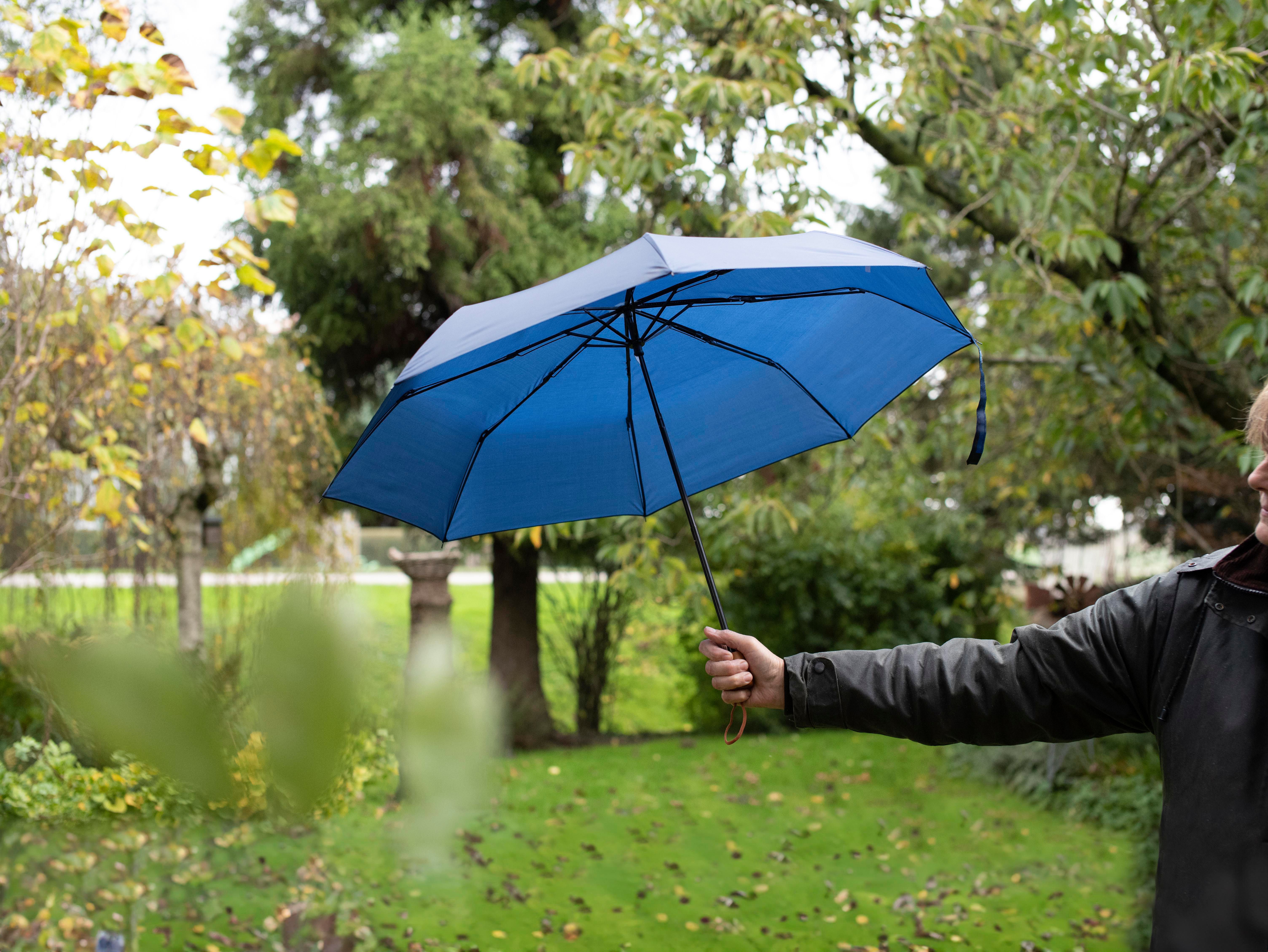 Paraguas plegable manual de 8 paneles de poliéster (190 T). Con puño de madera, varillas de metal, cierre velcro y funda de nailon a juego.
