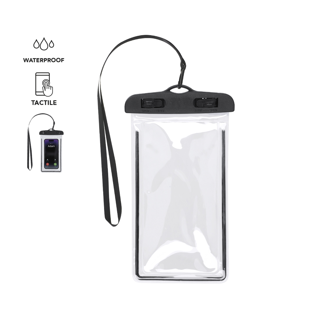 Portatodo impermeable fabricado en PVC, diseñado con función táctil para facilitar el uso de dispositivos. Con sistema de seguridad con cierre de palancas para una buena estanqueidad. Compatible con pantallas de hasta 6,7 pulgadas. Incluye cordón y mosquetón a juego para mayor comodidad.