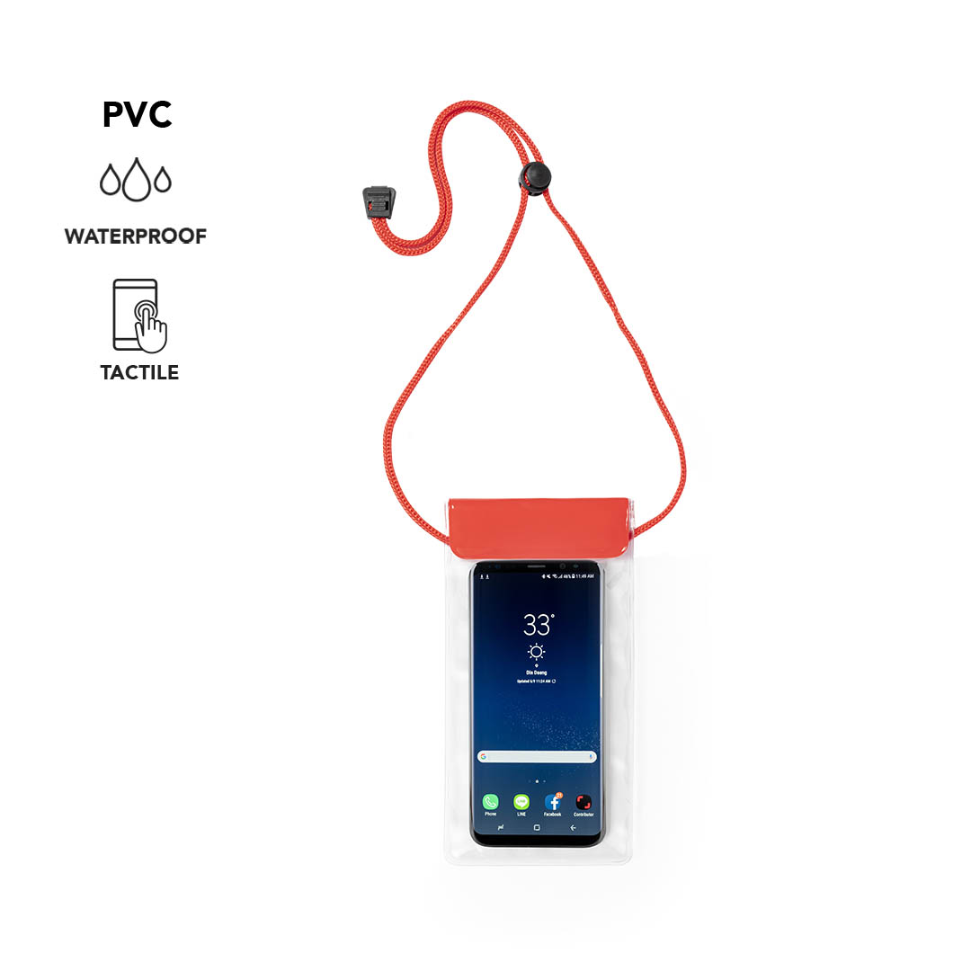 Práctico portatodo impermeable en PVC, con función táctil y doble sistema de seguridad para preservar la estanqueidad. Especialmente diseñado para dispositivos con pantalla de 6,5 pulgadas. Con cordón a juego, accesorio de ajuste y amplia superficie de marcaje.