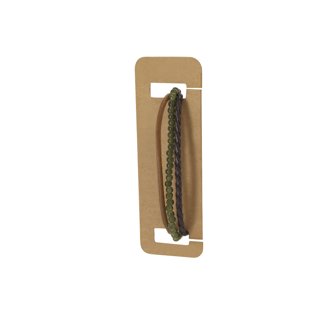 Pulsera confeccionada en piel, diseñada con la combinación de tres cordones: cuero marrón claro con acabado liso, central con cuentas de vidrio en color verde y un tercero de cuero trenzado marrón. Con cierre ajustable de suave algodón encerado. Presentada en cartón kraft con superficie lisa para el marcaje.