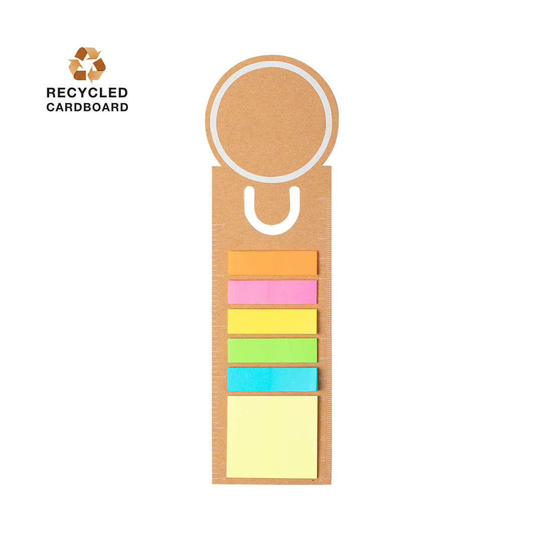 Regla marcapáginas de línea nature. En cartón reciclado y con amplia superficie de marcaje. Incluye 15 notas adhesivas medianas y 75 mini notas ahesivas