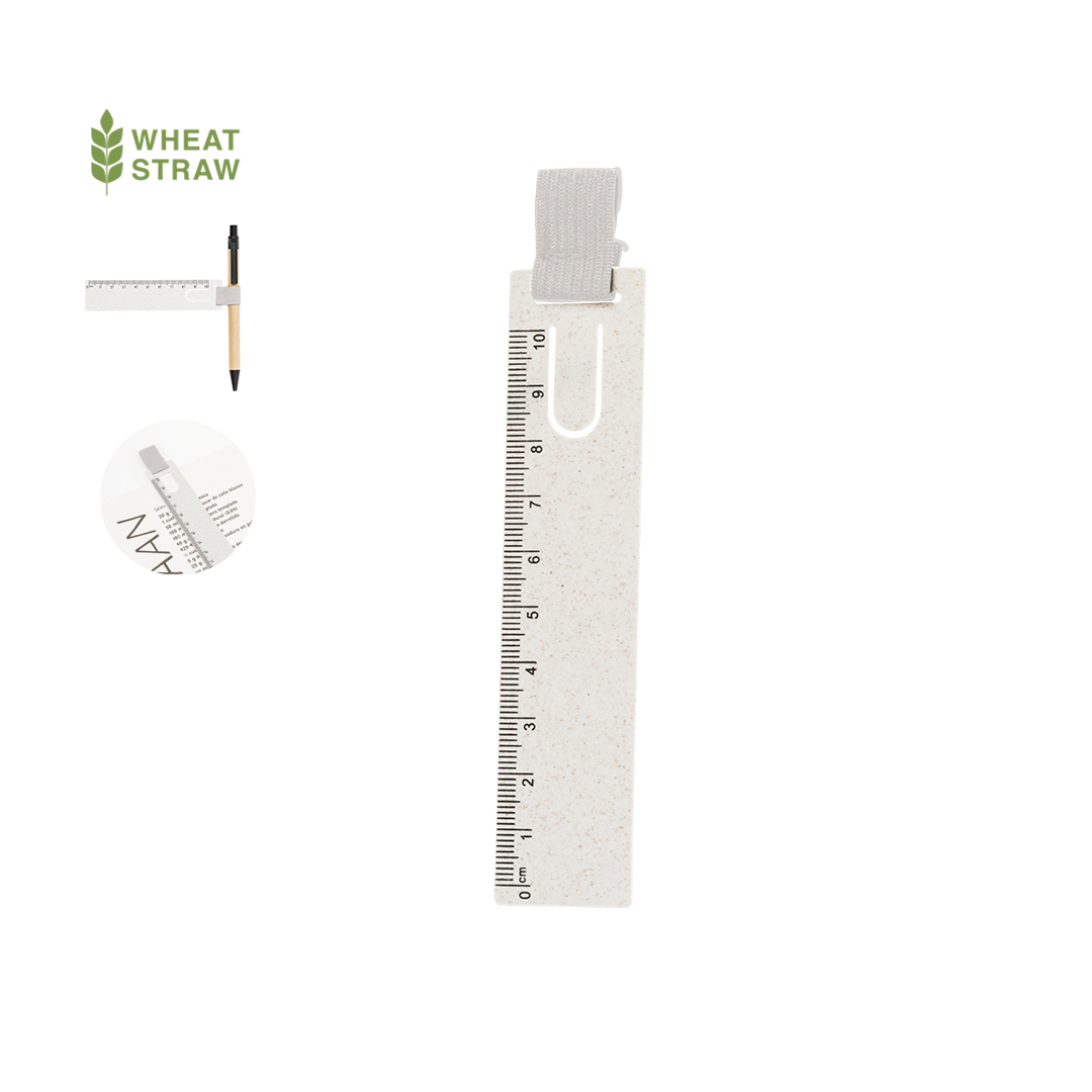 Original regla marcapáginas hecho en caña de trigo. Práctico utensilio de medida de hasta 10cm con pestaña para usar como marcapáginas y goma elástica para sujetar bolígrafos. Fabricado en caña de trigo y poliéster. Presentado individualmente en una bolsa de papel reciclada. La caña de trigo fomenta la utilización de materias primas naturales, reduciendo así las emisiones contaminantes.