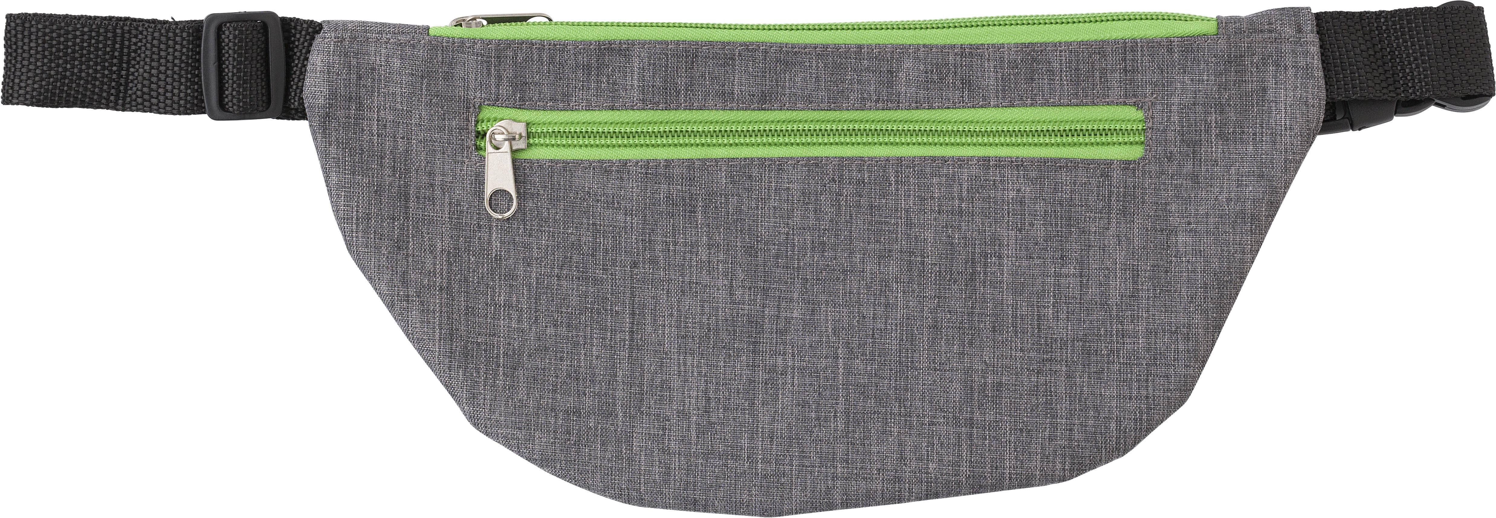 Riñonera de poliéster (300 D) con correa ajustable. Tiene un compartimento principal y un bolsillo frontal, ambos con cremallera.