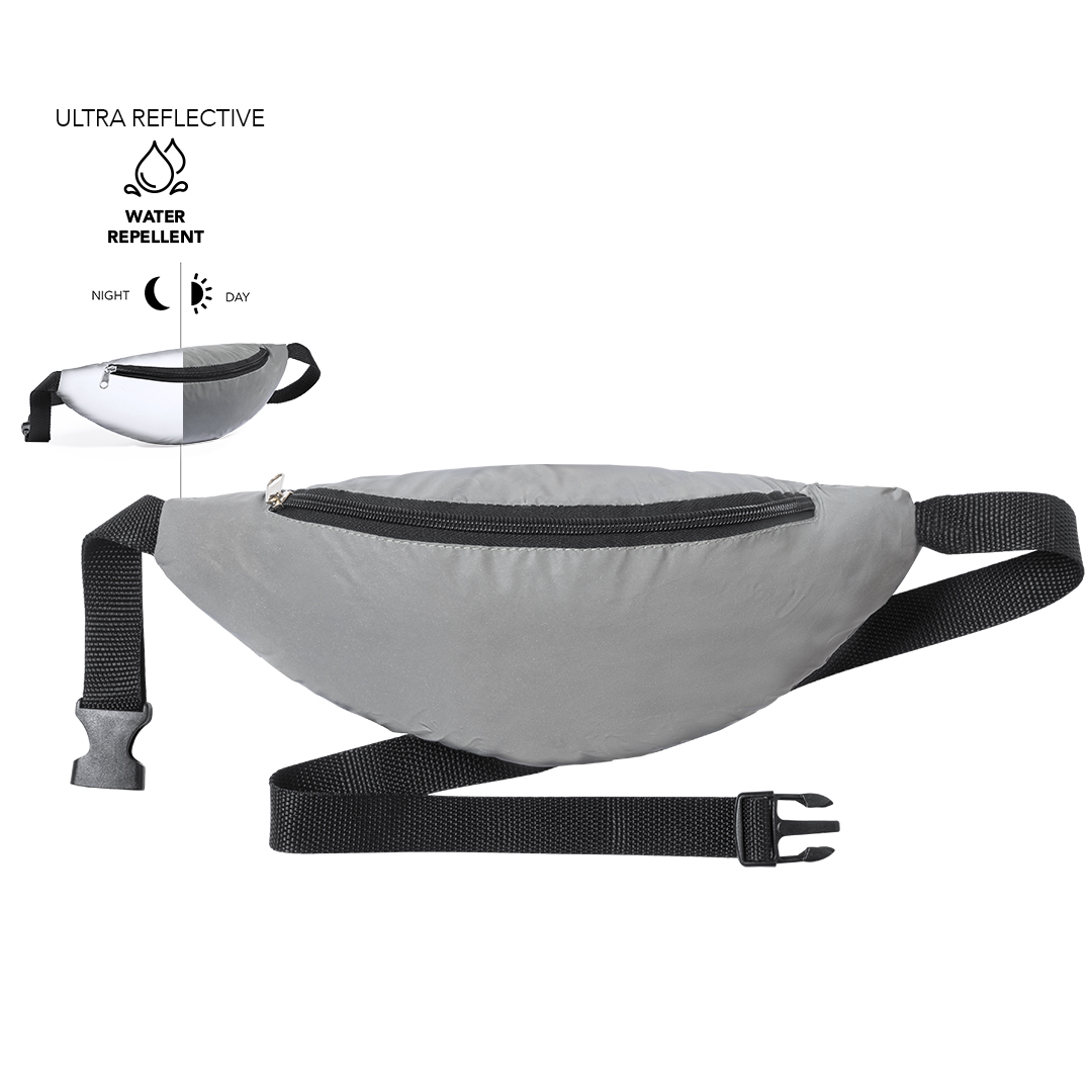 Riñonera en resistente poliéster 210T. Fabricada empleando tejido con gran capacidad para reflejar intensamente la luz, gracias a millones de pigmentos reflectantes y basándose en el principio de la retro-reflexión de la luz, una propiedad de visibilidad nocturna que consiste en la refracción de la luz hacia la fuente de origen de la misma. Con bolsillo de cierre de cremallera y cinta con cierre de hebilla ajustable. Diseñada para el día a día y actividades de ocio. Resistente al agua.