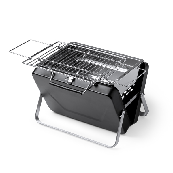 Barbacoa portátil para carbón realizada en acero inoxidable. Se pliega en formato maletín para hacer más fácil su transporte. Cuenta con una parrilla abatible haciendo más fácil y versátil su uso, además de patas de sujeción plegables, otorgándole seguridad y estabilidad.