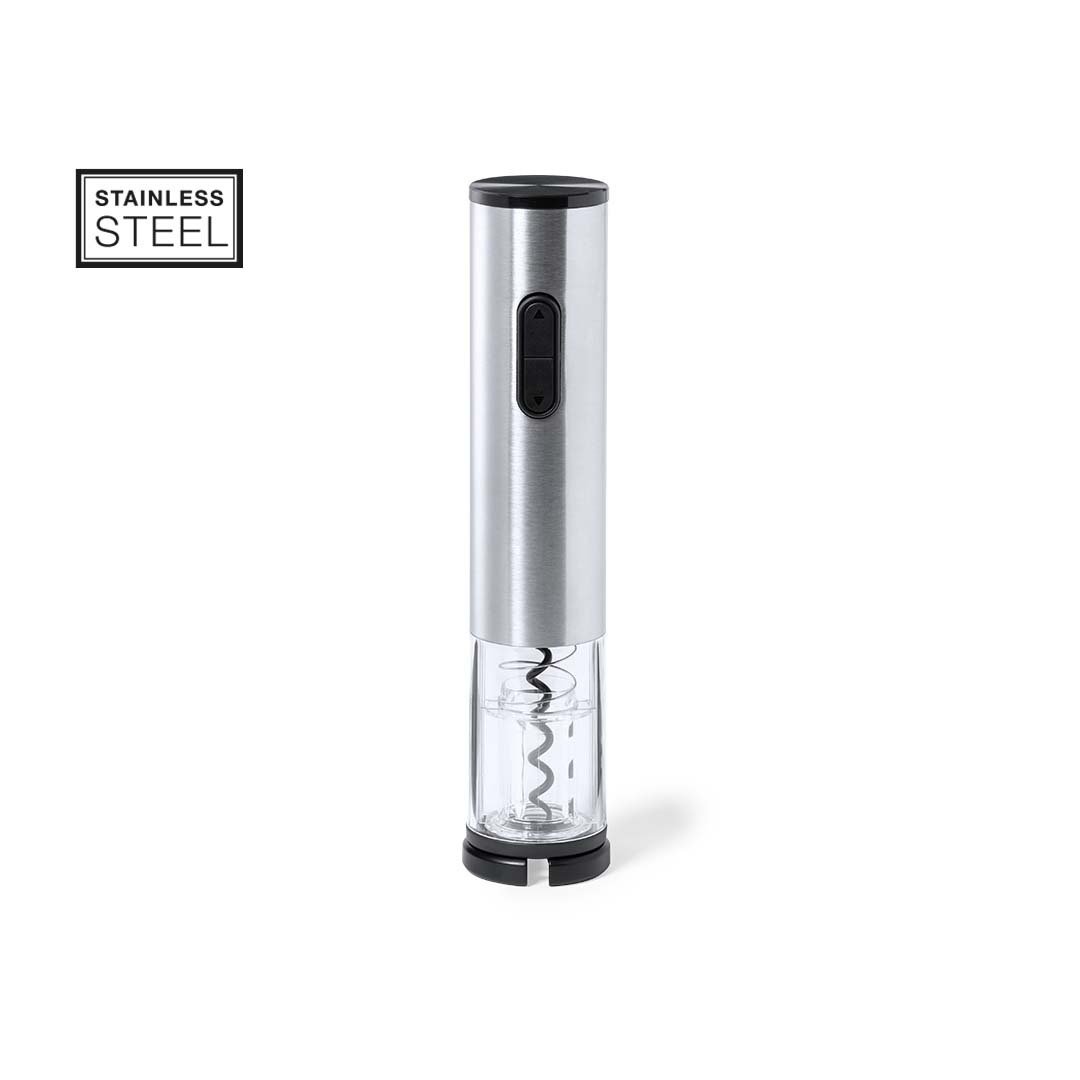 Sacacorchos eléctrico fabricado en acero inox y resistente ABS, con cortacápsulas incluido. Presentado en caja individual de diseño, con manual de instrucciones en español e inglés. Alimentación a pilas (4xAA no incluidas).