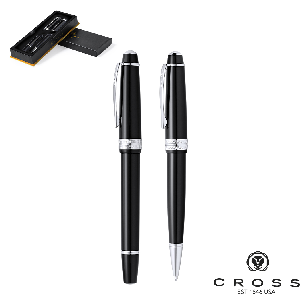 Set de bolígrafo y roller de Cross modelo Bailey Light, que combina una resina de alto brillo con acabados metálicos de cromo pulido. De cartucho jumbo y en tinta negra. Presentado en elegante estuche individual de color negro con logotipo de la marca, e interior en suave antelina.
