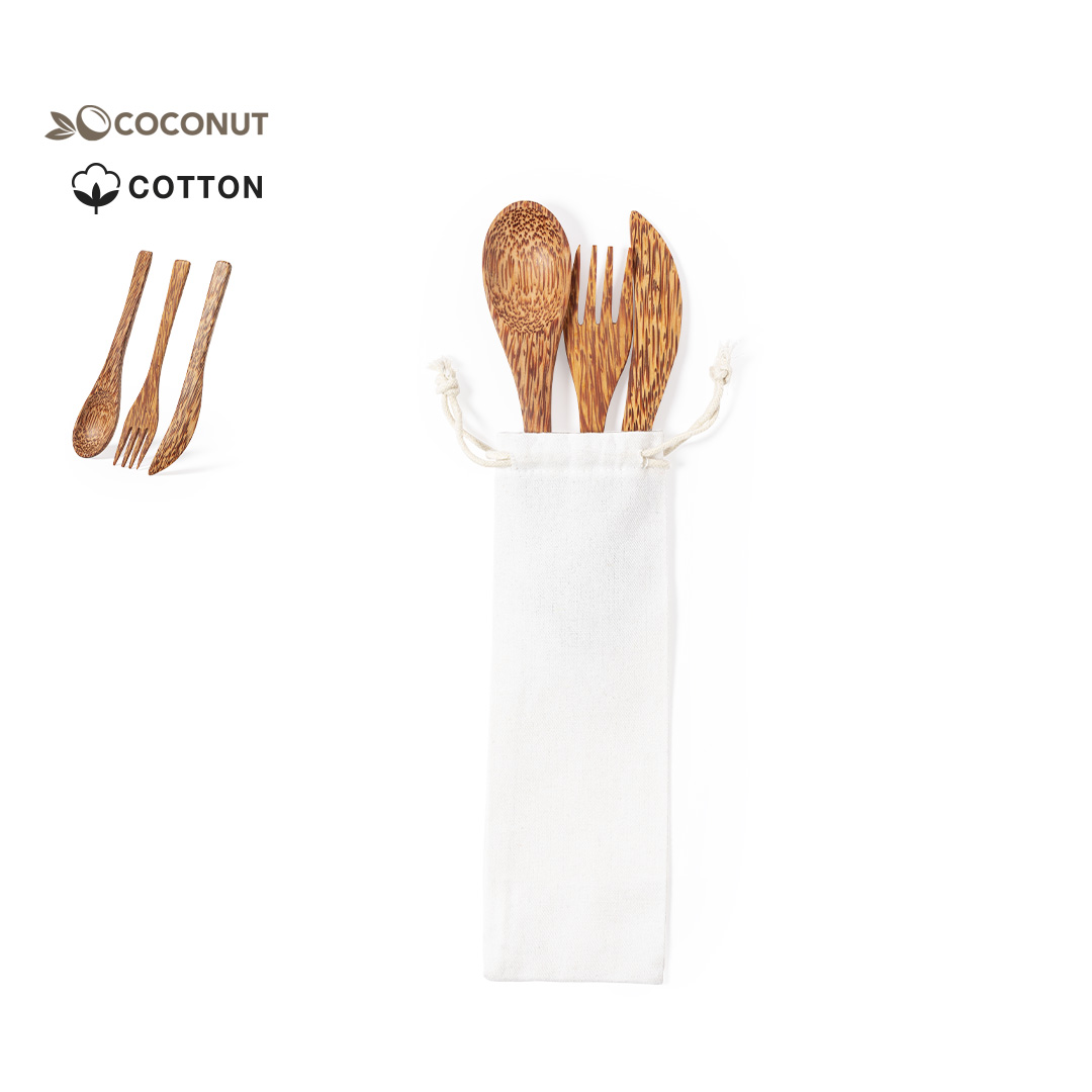 Set de cubiertos reutilizables de línea nature fabricados en coco. Tras el consumo de su fruto, del coco y su planta se pueden obtener multitud de productos, contribuyendo a la sostenibilidad del planeta y fomentando el uso de materias primas naturales. Incluye cuchara, cuchillo y tenedor. Presentados en bolsita individual de algodón con cierre de cordón.