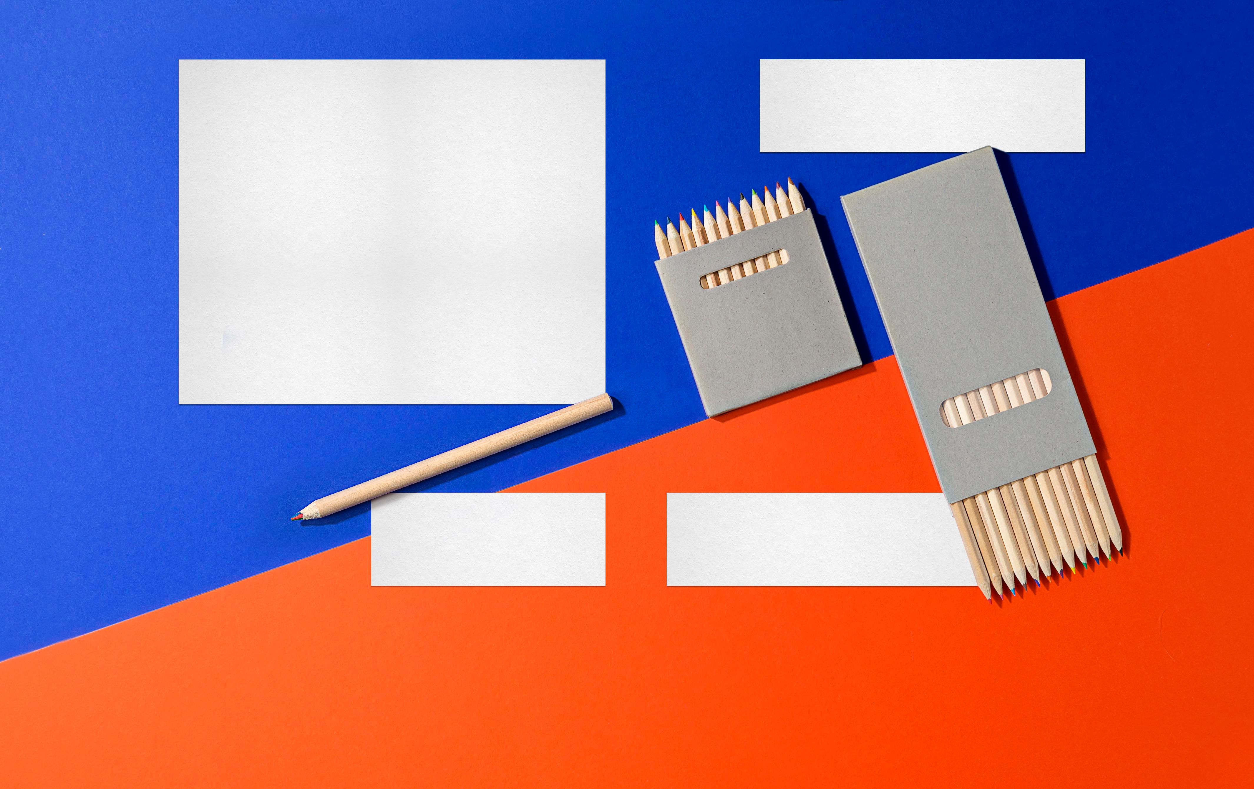 Caja de cartón con 12 lápices largos de madera, de diferentes colores.