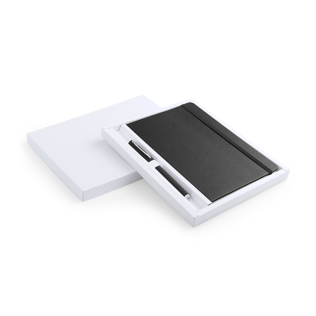 Set de bloc de notas con tapas de suave tacto acabadas en polipiel y bolígrafo de suave cuerpo a juego. De 100 hojas lisas con elástico de sujeción y marcapáginas de tela a juego. Presentado en elegante estuche de cartón blanco troquelado. Bolígrafo en tinta azul.