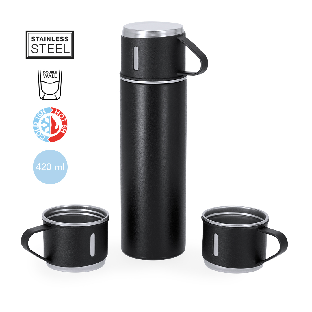 Set de termo con 3 tazas fabricado en acero inox. Termo de 420 ml de capacidad y de doble pared, que garantiza una mejor y más duradera conservación de la temperatura, con dosificador de seguridad. Tazas de 140ml, ajustables mediante rosca y en elegante diseño negro, ideales para disfrutar de la bebida, ya sea caliente o fría, en cualquier momento y lugar. Presentación en elegante estuche de color negro.
