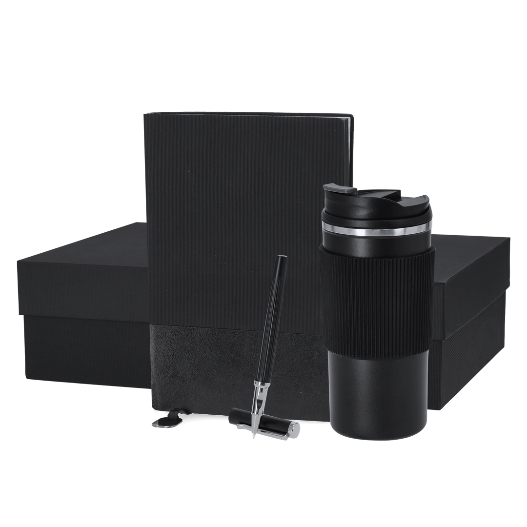 Elegante set premium. Incluye: - Vaso térmico fabricado en acero inoxidable de doble pared con capacidad de 470 ml. Con un dosificador en tapadera, libre de BPA, sistema de apertura abre fácil, banda de silicona a juego y base antideslizante. - Bloc de notas con tapas blandas fabricado en elegante PU color negro. Su diseño combina texturas lisas y biseladas. Incluye marcapáginas de tela con accesorio metálico especial para marcaje en láser. Interior con 100 hojas en color crema, de disposición a una raya y bordes en negro. - Roller de acabado negro mate con detalles metálicos en color plata. De cuerpo biselado, con cierre de capucha, clip y tinta azul. Cuenta con cómodo agarre en metal pulido.Presentado en sosfisticado estuche individual de acabado mate, con interior troquelado para cada uno de los elementos del set.