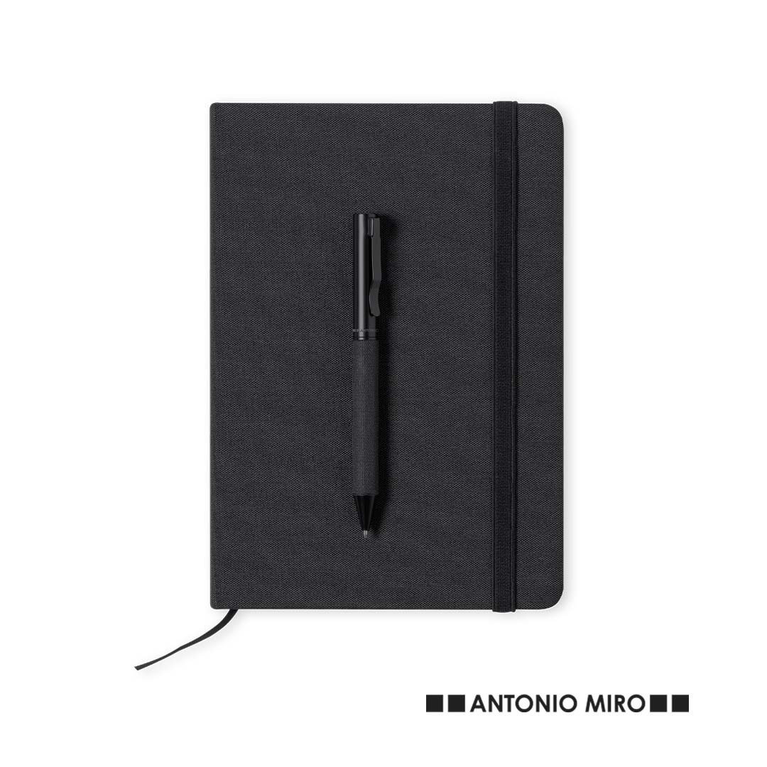 Set de bloc de notas y bolígrafo de Antonio Miró. Incluye: Bloc de notas de elegante acabado en negro, fabricado en resistente poliéster 300D, con tapas rígidas y elástico de sujeción a juego. Interior con 100 hojas de disposición a una raya. Bolígrafo metálico de mecanismo giratorio y en tinta azul. Con cuerpo y detalles en negro, clip metálico y logotipo de la marca. Set presentado en elegante y resistente caja individual negra con logotipo Antonio Miró y funda de protección a juego.