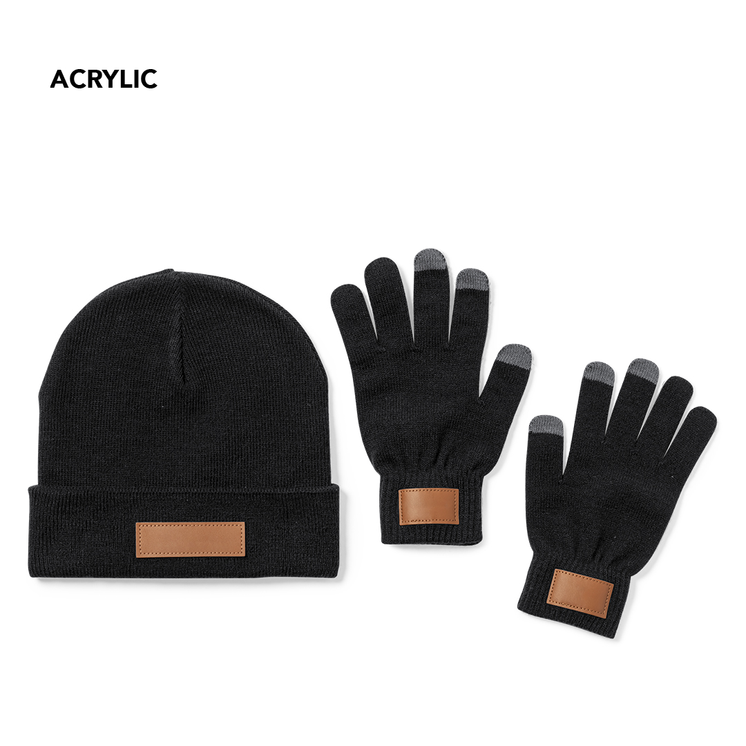 Set de gorro y guantes en talla adulto, fabricados en material acrílico elástico y con parche en polipiel cosido para marcaje. Incluye: Par de guantes con 3 dedos táctiles y elástico de ajuste en muñeca. Gorro a juego con dobladillo.