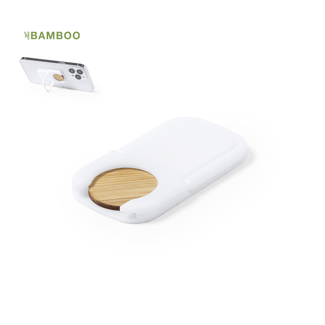 Soporte multifunción para smartphone, con moneda para carro de la compra integrada y anilla/soporte plegable. Cuerpo fabricado en resistente ABS de acabado blanco, con moneda en bambú. Con adhesivo de fijación extra fuerte y libre de residuos al despegarlo del dispositivo.