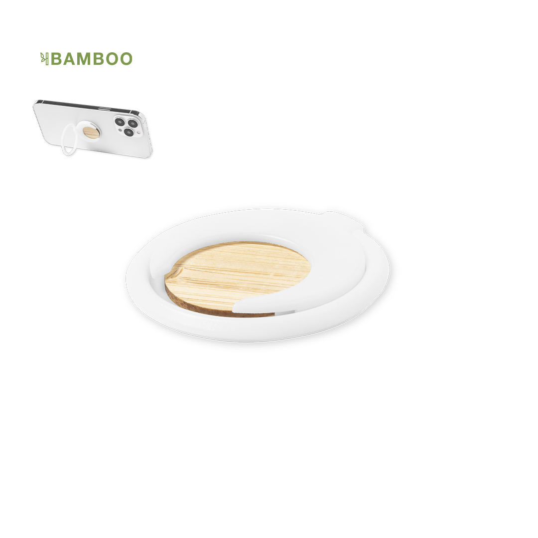 Soporte multifunción para smartphone, con moneda para carro de la compra integrada y anilla/soporte plegable. Cuerpo fabricado en resistente ABS de acabado blanco, con moneda en bambú. Con adhesivo de fijación extra fuerte y libre de residuos al despegarlo del dispositivo.