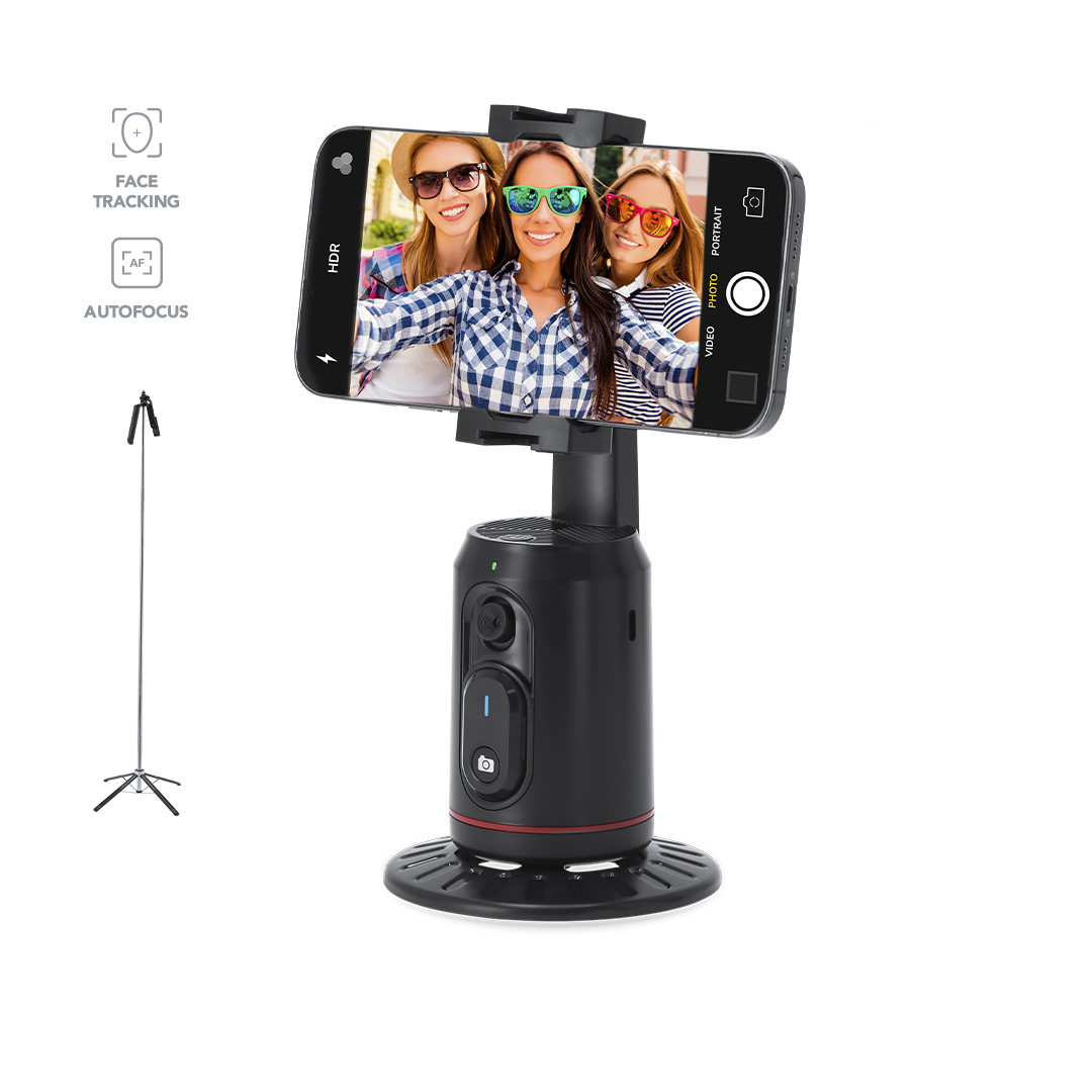 Soporte de seguimiento automático con base y trípode. Incluye:- Lente óptica de alta calidad con inteligencia artificial que posibilita un seguimiento avanzado 360º y doble ángulo de reconocimiento. Ideal para grabar tanto de pie como sentado, asegurando un acompañamiento constante sin importar el movimiento.- Controles gestuales intuitivos para una grabación impecable, iniciando el seguimiento, pausando la grabación o cancelándola con unos simple gestos de mano, que posibilitan una experiencia de grabación sin interrupciones.- Compatibilidad universal y funcionamiento sin aplicaciones para streaming y vlogs, ya que se integra en las plataformas más populares, ofreciendo una experiencia plug-and-play para todos los usuarios.- Disparador extraíble de conexión Bluetooth integrado en la carcasa y batería de litio de 1200 mAh, de gran autonomía. Montaje versátil con rosca 1/4”, compatible con una amplia gama de accesorios y trípodes. - Base antideslizante para uso de sobremesa.- Trípode telescópico de diseño compacto. 360º con rosca 1/4”, de mecanismo extensible y con base desplegable antideslizante, ajustable en altura para las diversas necesidades de grabación, asegurando que los vídeos se capturen desde el ángulo perfecto. Incluye disparador de conexión Bluetooth integrado en el mango, extraíble y recargable. Con soporte universal para smartphone, telescópico y ajustable. Base y disparadores recargables mediante cable USB Tipo C .Base y trípode con presentación en estuches individuales de diseño kraft.Fabricado conforme a los estándares RoHS y en cumplimiento con los siguientes requisitos de seguridad:Sistema de protección contra sobrecalentamiento.Sistema de protección contra sobrecarga.Sistema de bloqueo para evitar cortocircuitos.