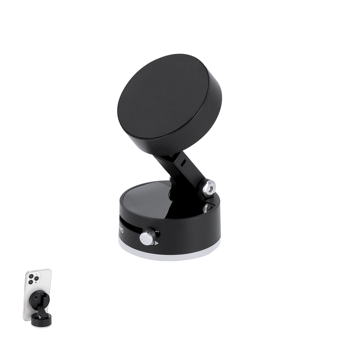 Soporte magnético para teléfono en ABS. Sujeción a través de ventosa con botón de activar/desactivar ON/OFF. Incluye anillo metálico magnético . Dispone de un soporte retráctil ajustable, ideal como solución para asegurar tu dispositivo de forma estable y versátil en cualquier superficie.