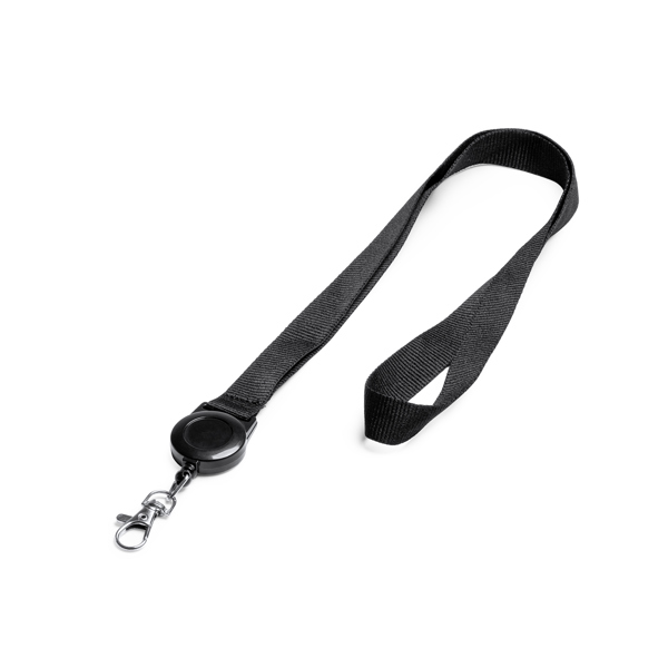Lanyard con accesorio retráctil extensible. Incluye mosquetón.