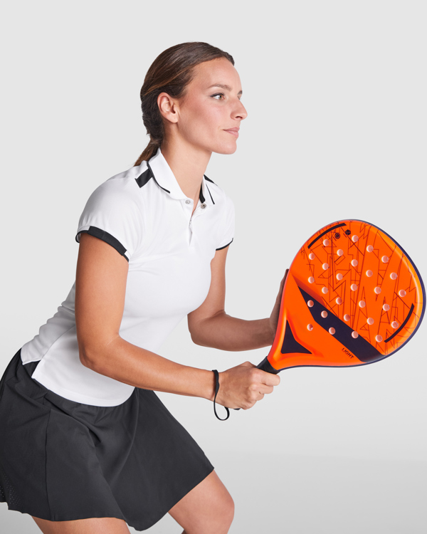 Polo técnico de mujer entallado de manga corta en poliéster reciclado antibacteriano. Cuello y detalle ribete de mangas en canalé 1x1. Cubrecosturas reforzado en cuello. Tapeta con 2 botones automáticos. Piezas de hombros y detalles a contraste. Aperturas laterales en el bajo.