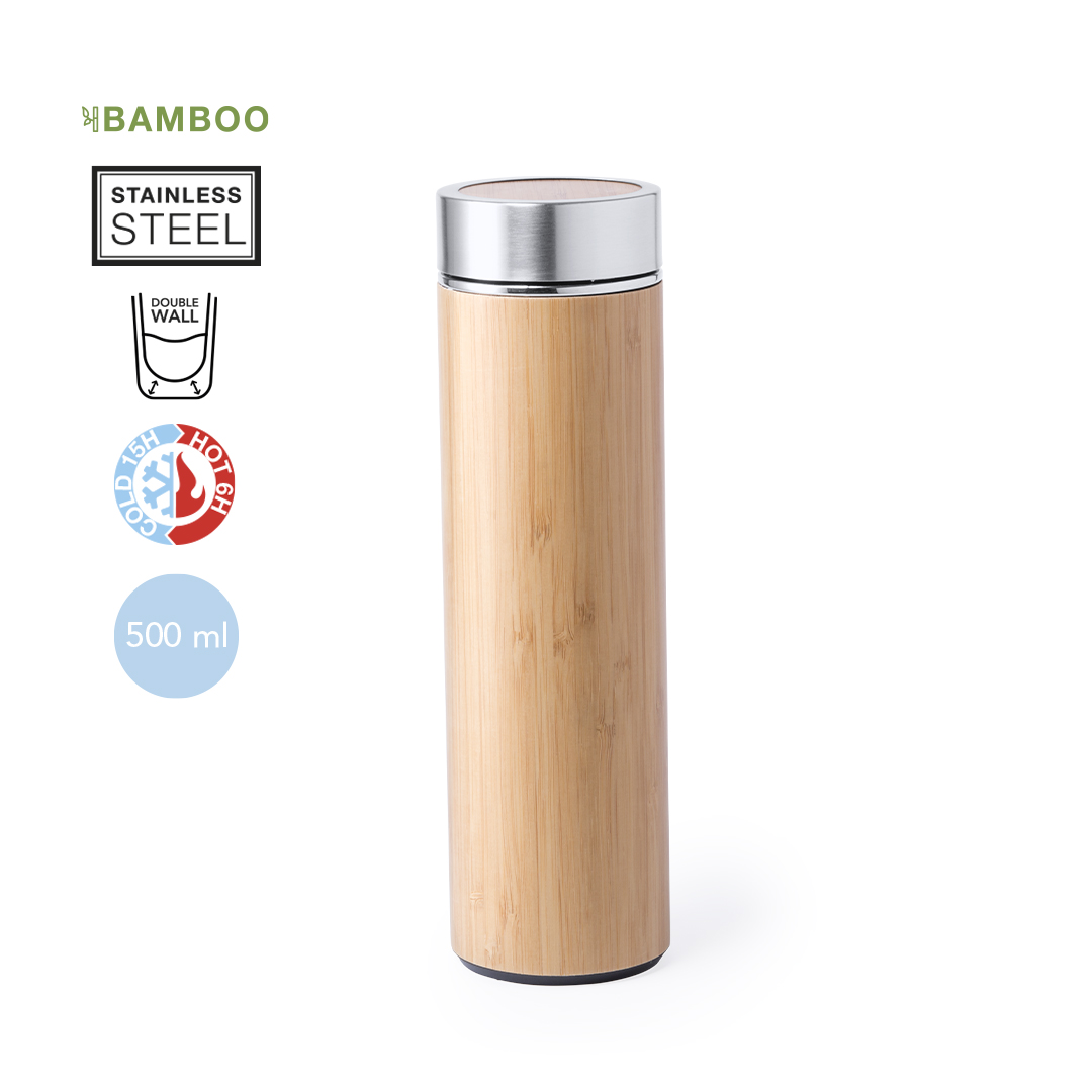 Termo en alta calidad y 500 ml de capacidad, con cuerpo acabado en bambú e interior en acero inox. Tapón de seguridad a rosca en acero inox y bambú. Presentado en una atractiva caja de diseño.