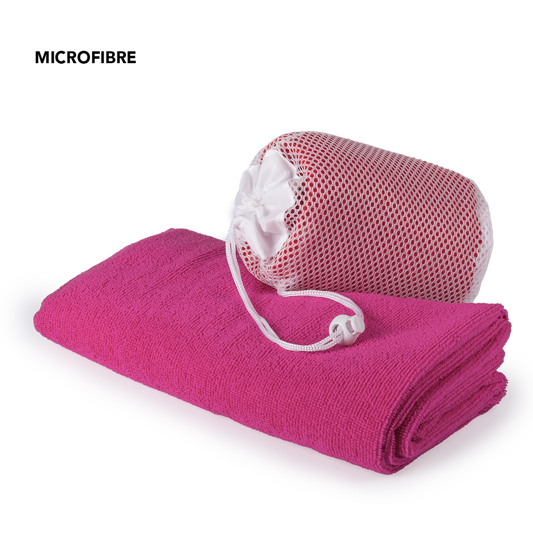 Toalla de 100x50cm en absorbente y suave microfibra de 185g/m2 en variados colores. Presentada en práctica bolsa de transporte de redecilla con accesorio de ajuste.
