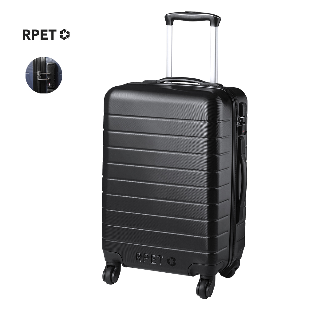 Trolley de cabina de línea nature resistente a los golpes, fabricado en material RPET elaborado a partir de plástico reciclado, para así fomentar la reutilización de residuos plásticos y contribuir a la sostenibilidad del planeta. Asa de transporte telescópica, con 4 ruedas giratorias y cierre de seguridad TSA. Forro interior en RPET, con cintas elásticas de sujeción incluidas. Distintivo RPET grabado en frontal.