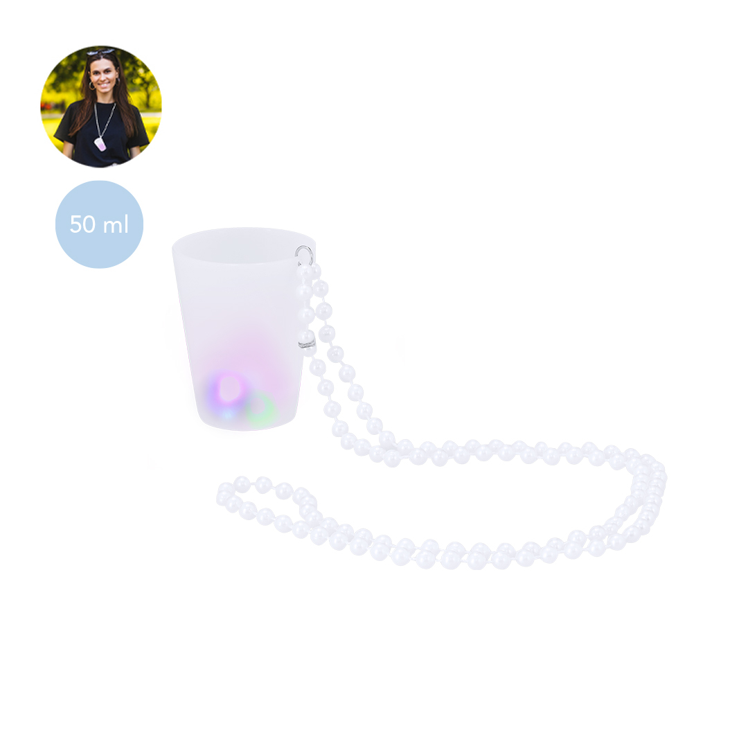 Vaso tamaño chupito con luces LEDsy 50 ml de capacidad. Fabricado en PS. Incluye práctico cordón para colgarlo cómodamente al cuello. Dispone de un botón en la base para activar las luces, ofreciendo 3 modos de iluminación: luz fija e intermitente en diferentes velocidades. Alimentado mediante pilas de botón (incluidas). Libre de BPA.