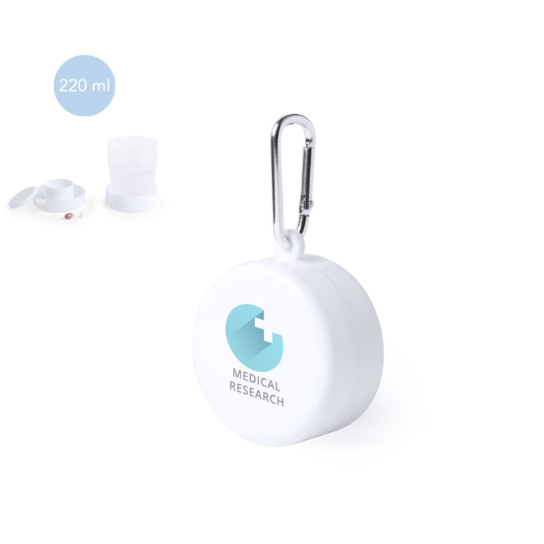 Original vaso plegable para emergencias en elegante color blanco. De 220ml de capacidad y pastillero con tapa integrado en el tapón. Con mosquetón metálico de transporte.