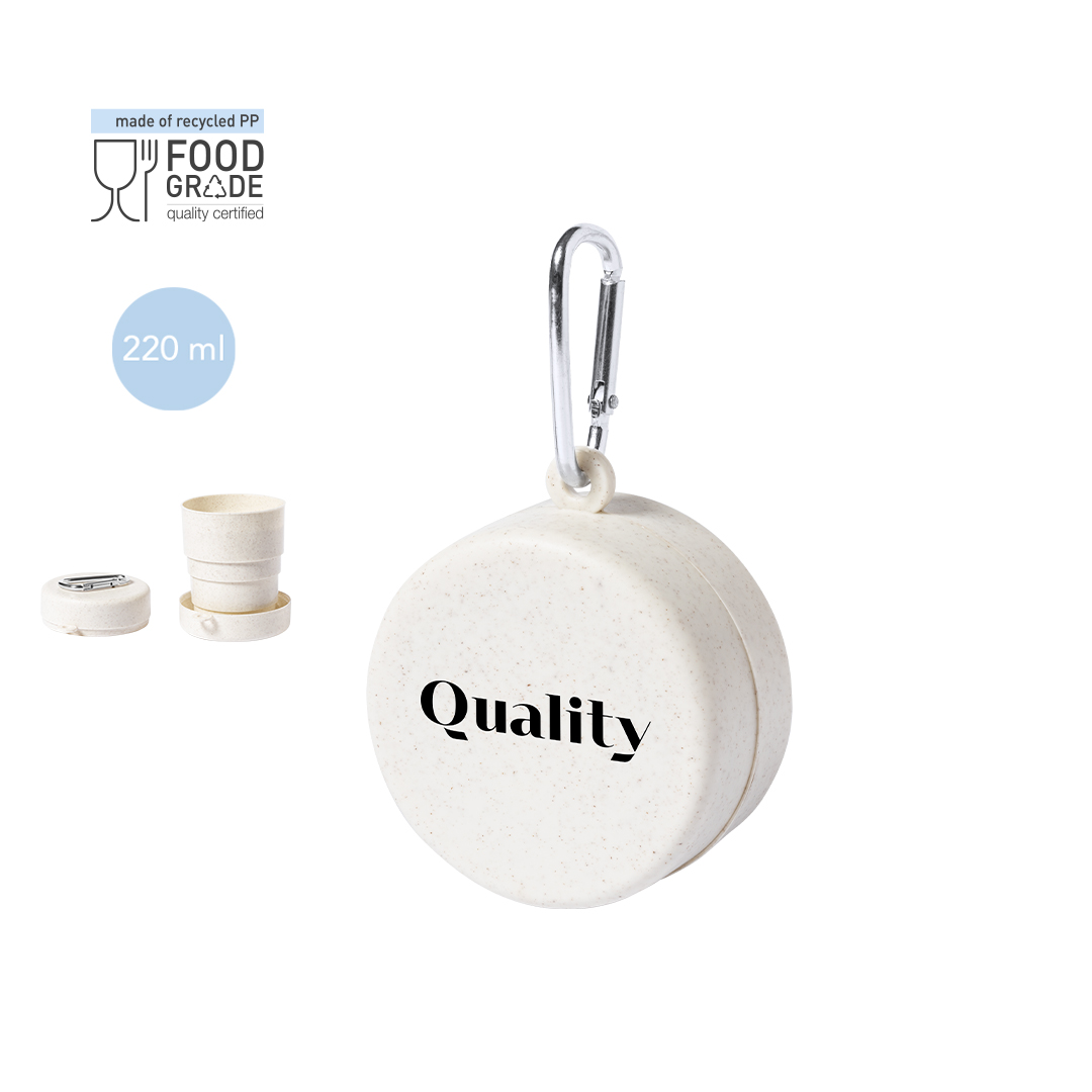 Original vaso plegable para emergencias fabricado en PP veteado libre de BPA. De 220ml de capacidad, con mosquetón metálico de transporte. Certificación Food Grade, garantizando la seguridad cuando los alimentos entran en contacto con el material usado para fabricar el producto.