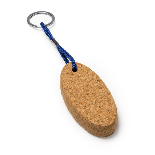 Llavero de corcho natural flotante ovalado con resistente cuerda en poliéster. El llavero mantendrá tus llaves seguras flotando si caen al agua. Un imprescindible para los días de playa.